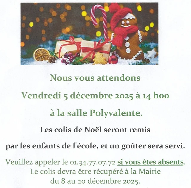 Les colis de Noël pour les anciens seront remis le vendredi 5 décembre 2025 à 14h à la salle polyvalente par les enfants de l'école, et un goûter sera servi à toute personne ayant reçu une invitation.
